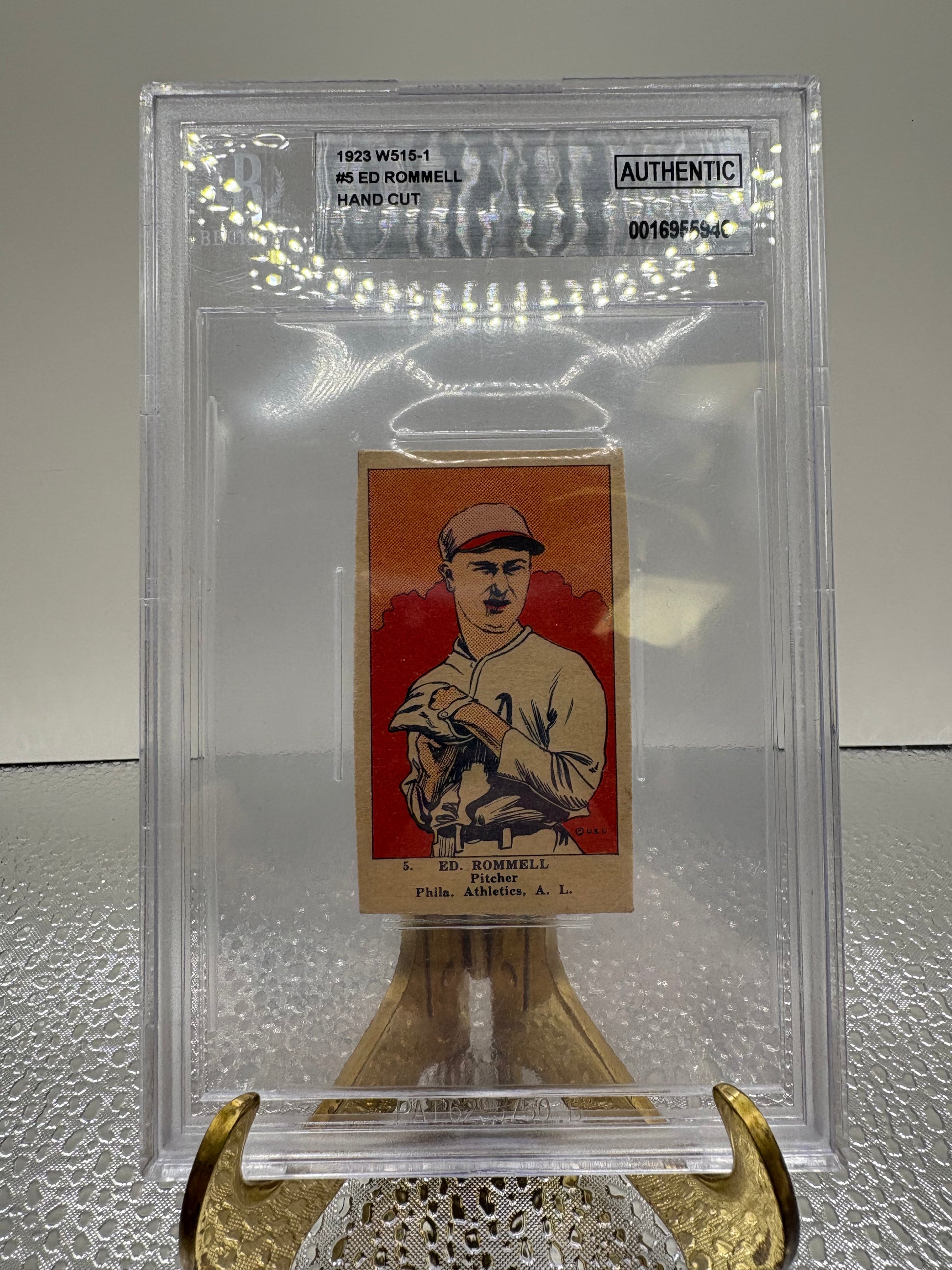 Add a rare piece of early baseball history to your collection with this authentic 1923 W515-1 Ed Rommell card from the American Tobacco Company’s famed W515 series. Known for its distinctive “Gold Borders” and classic portrait style, this set is highly prized by vintage baseball card collectors.